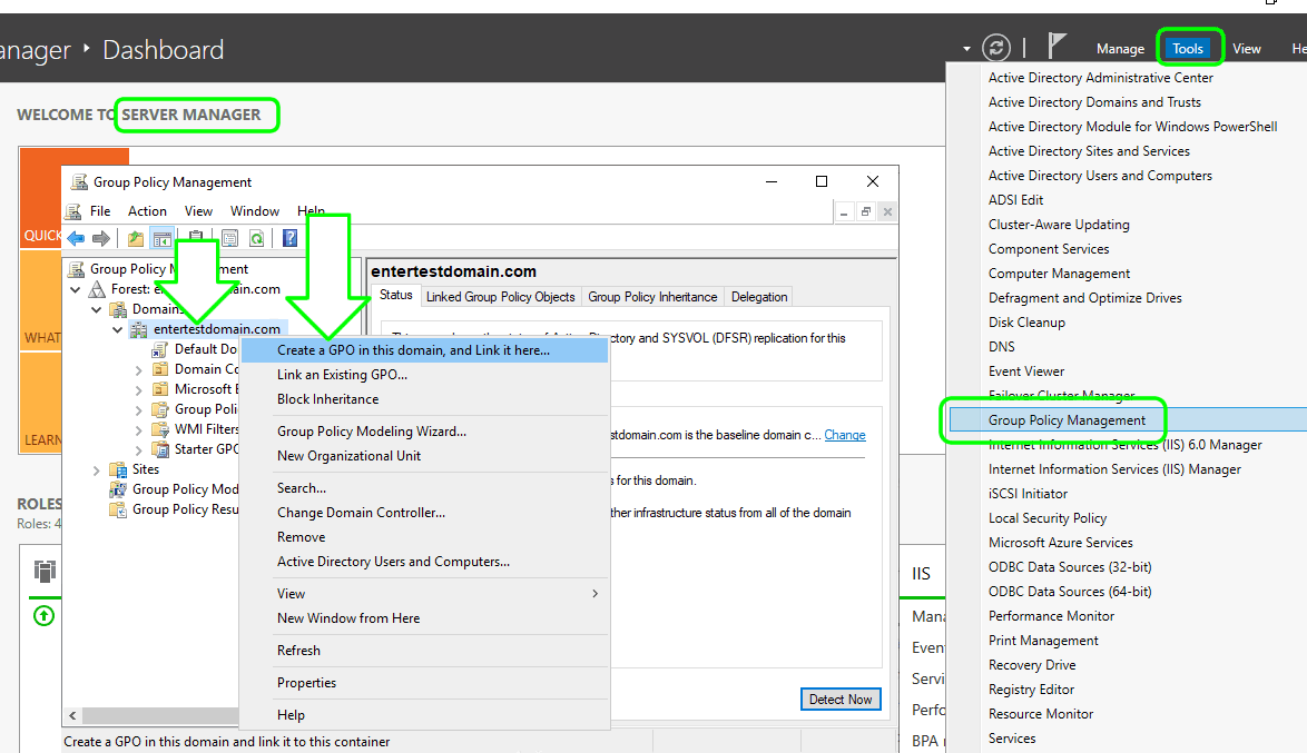 In Server Manager, go to “Tools” and then click on “Group Policy Management”. In the management window, right-click on the domain name and select the menu option to create a new Group Policy in the domain, as shown in the image below: