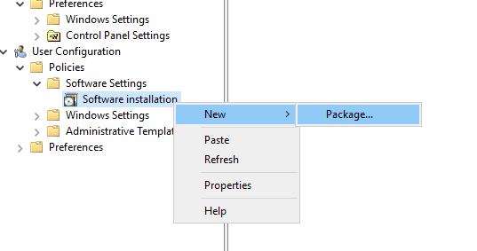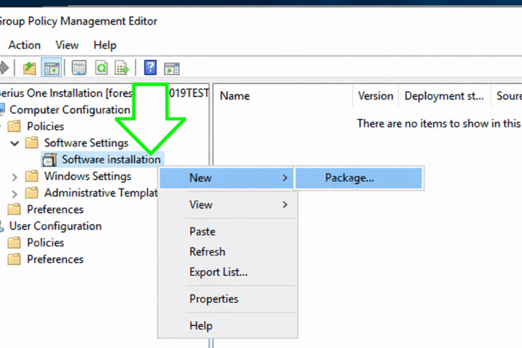 In the Group Policy Editor window, go to Computer Configuration and then right-click on “Software Installation”, as shown in the image, and select the menu option to add a new package: