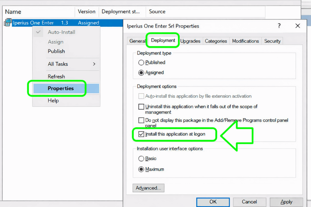 Now right-click on the newly created entry and select “Properties”. Then go to the “Deployment” tab and select the option to install the software at user logon.