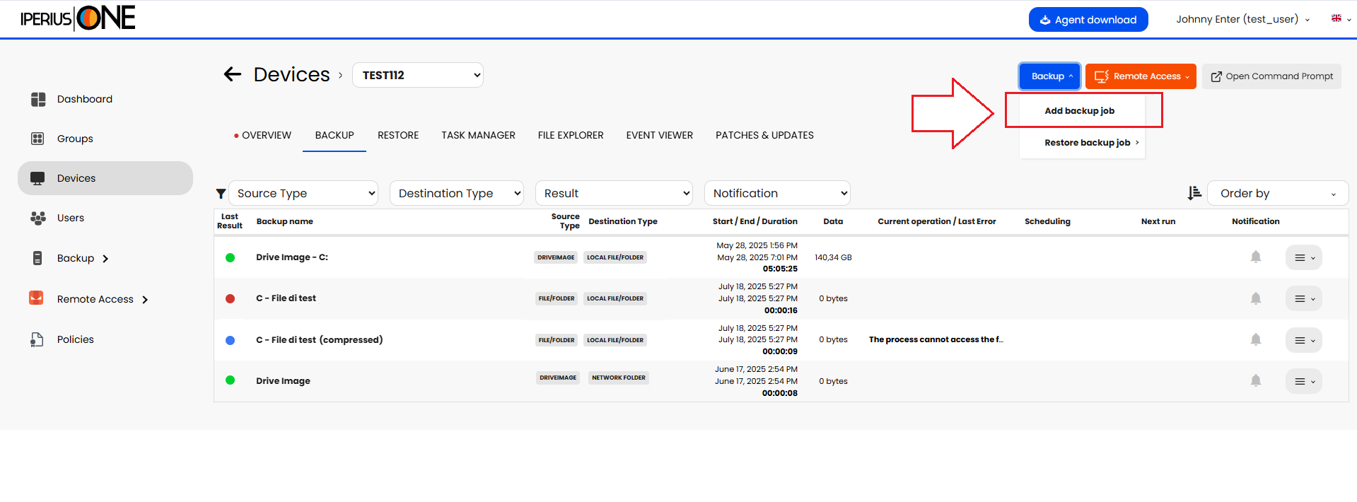 The job is now in the Device’s backup list, and you can perform various operations such as editing the job, duplicating it, deleting it, and most importantly, running it.