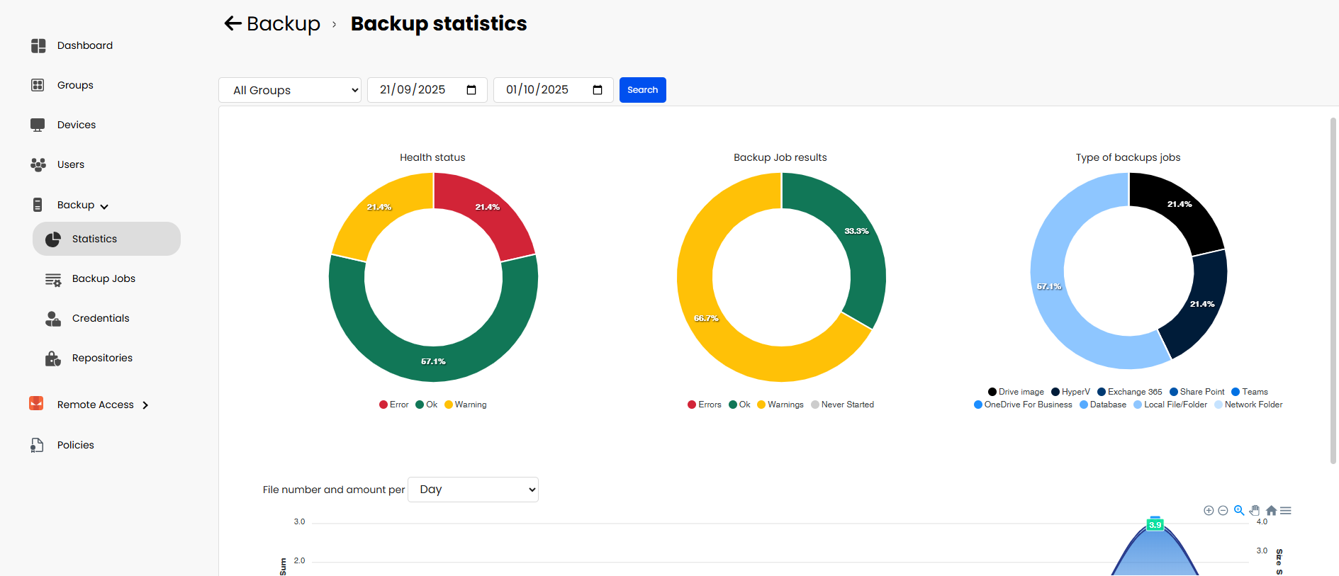 In “Statistics” we can immediately see the progress of the backups with clear graphs that provide various information such as the health of the devices, the status of the jobs, the type of jobs executed and the number and quantity of data copied: