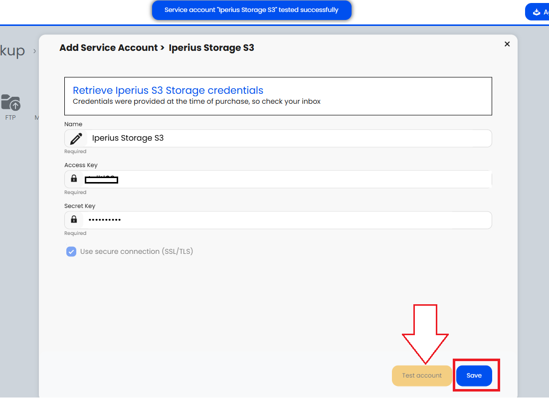 For example, let’s create and save a Cloud account, of the “Iperius Storage s3” type: