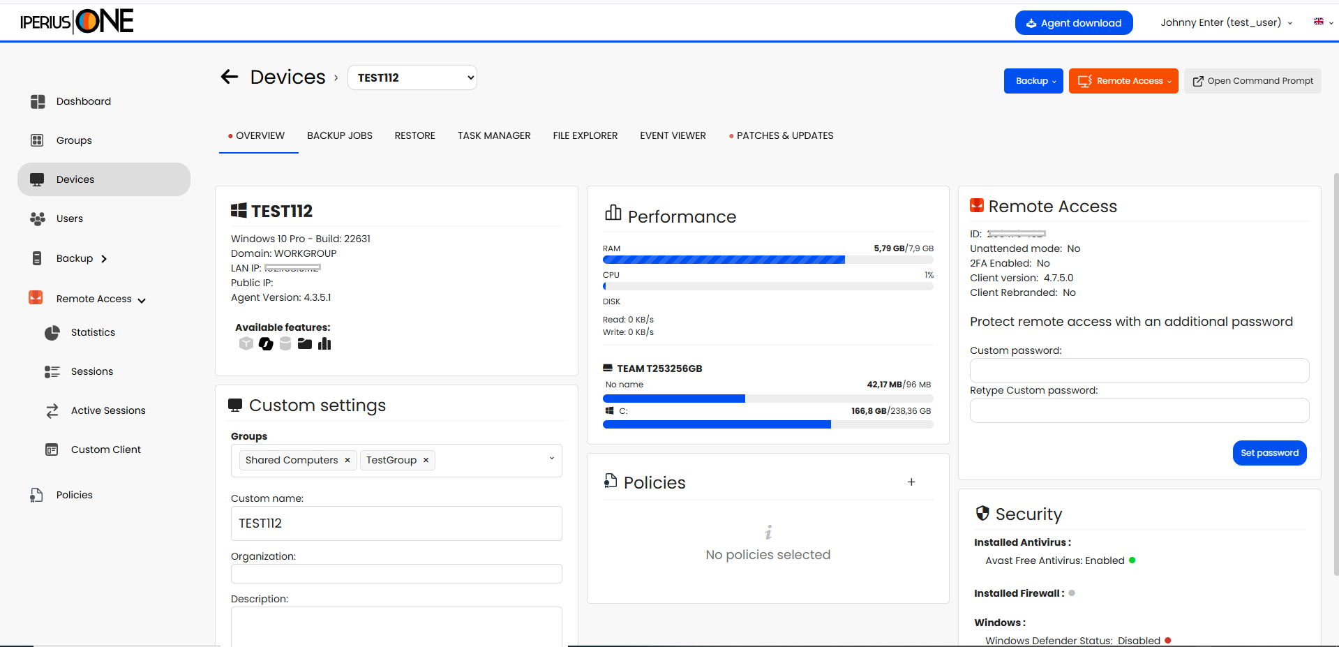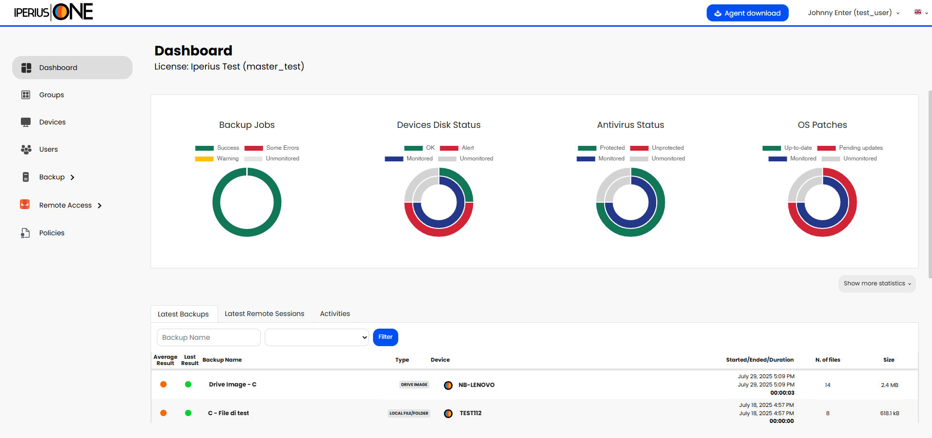 Designed for MSPs and IT professionals, Iperius One allows you to create, edit and monitor backups, access devices remotely , check system patches, disk status, antivirus , create specific policies to apply to certain computers or groups of computers, and much more — all from a single platform.