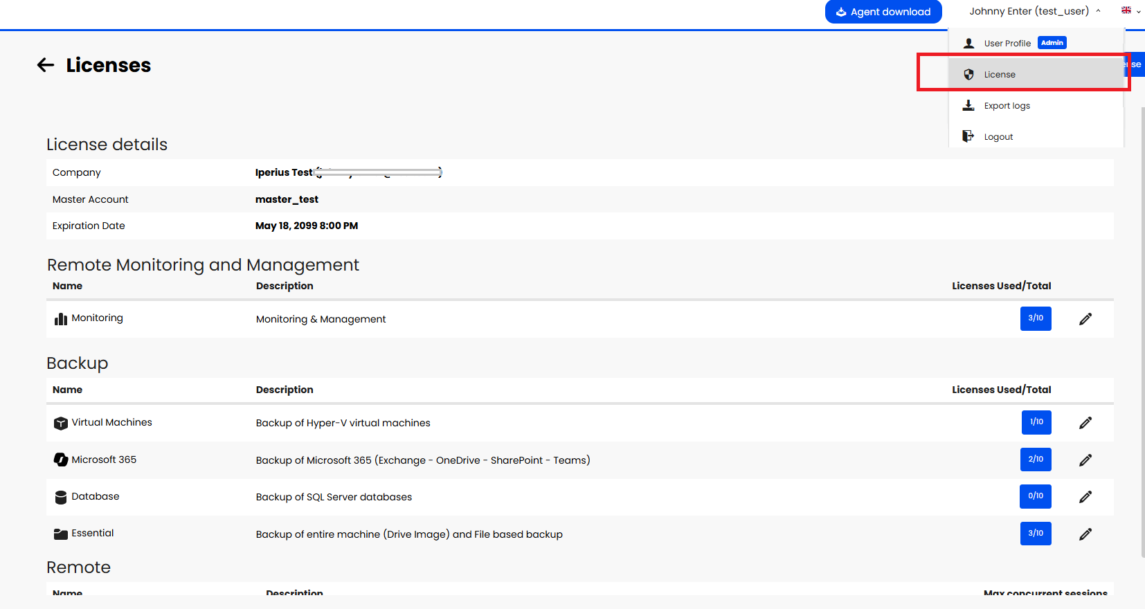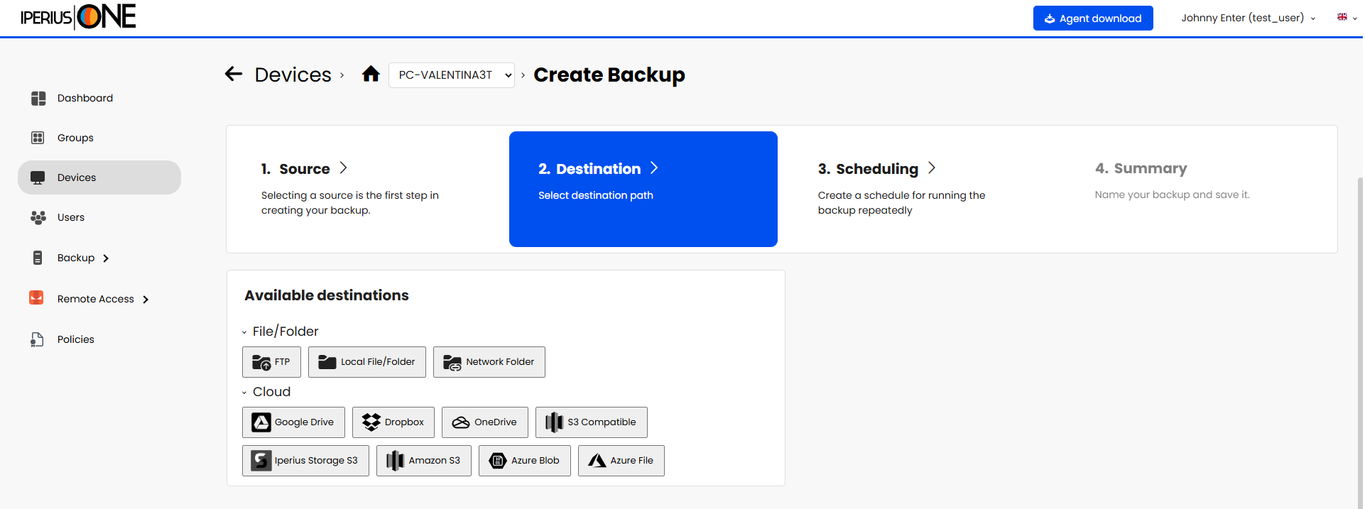 Please note : If you don’t have Iperius Remote, no devices will be present when you log in for the first time. If you already have an Iperius Remote license, in this section you’ll find all the computers associated with your license, on which you can install the Iperius One Agent (on all or some of them).