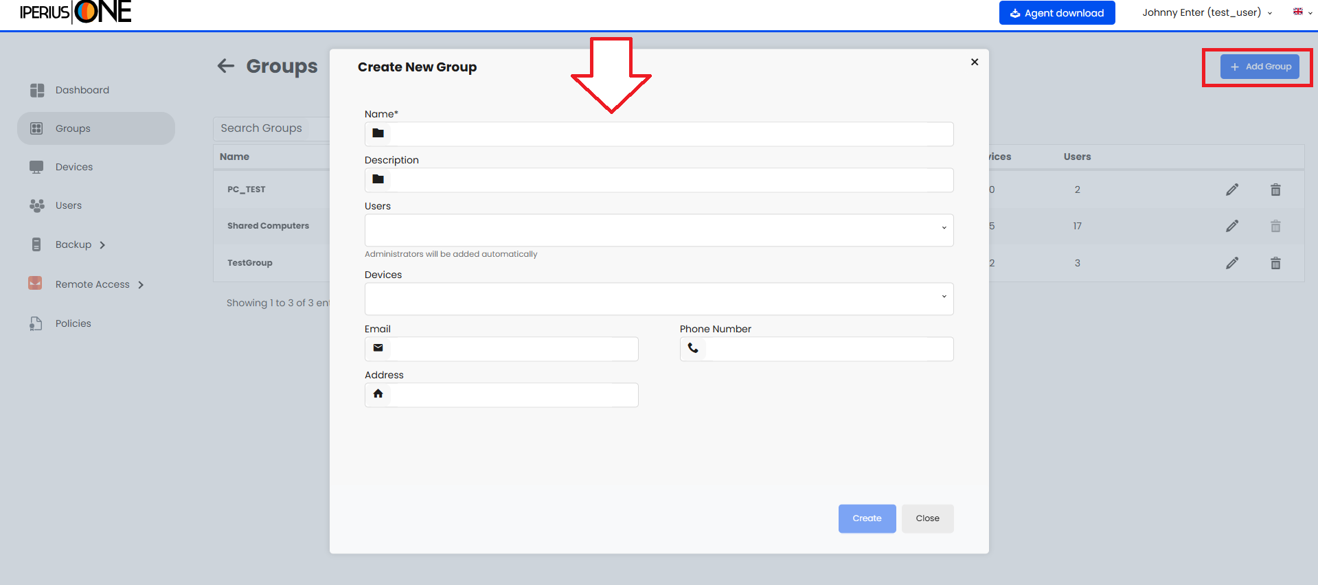 - Groups : Organize and manage devices in logical groups (e.g. by location or customer), then assign them to each User type to build what will then also be the Iperius Remote address book.