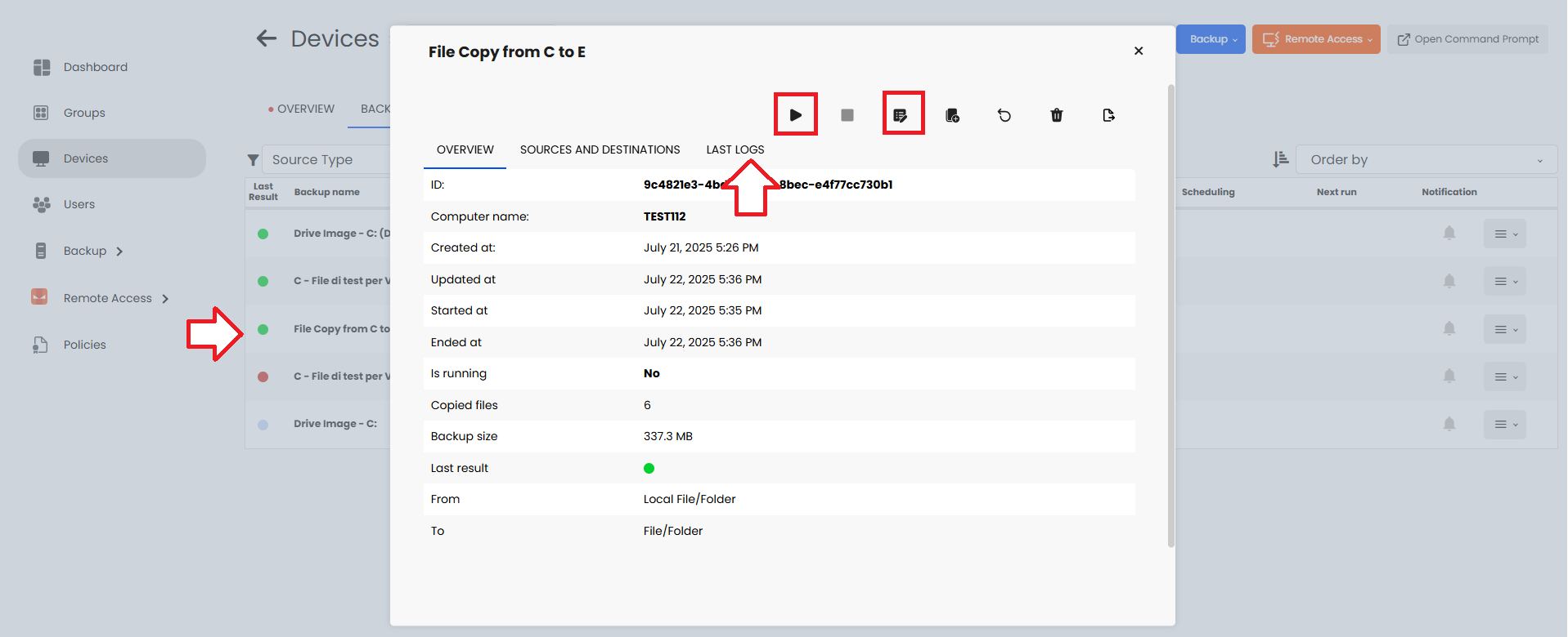 Once the job is finished, you can view the backup logs in the dedicated tab: