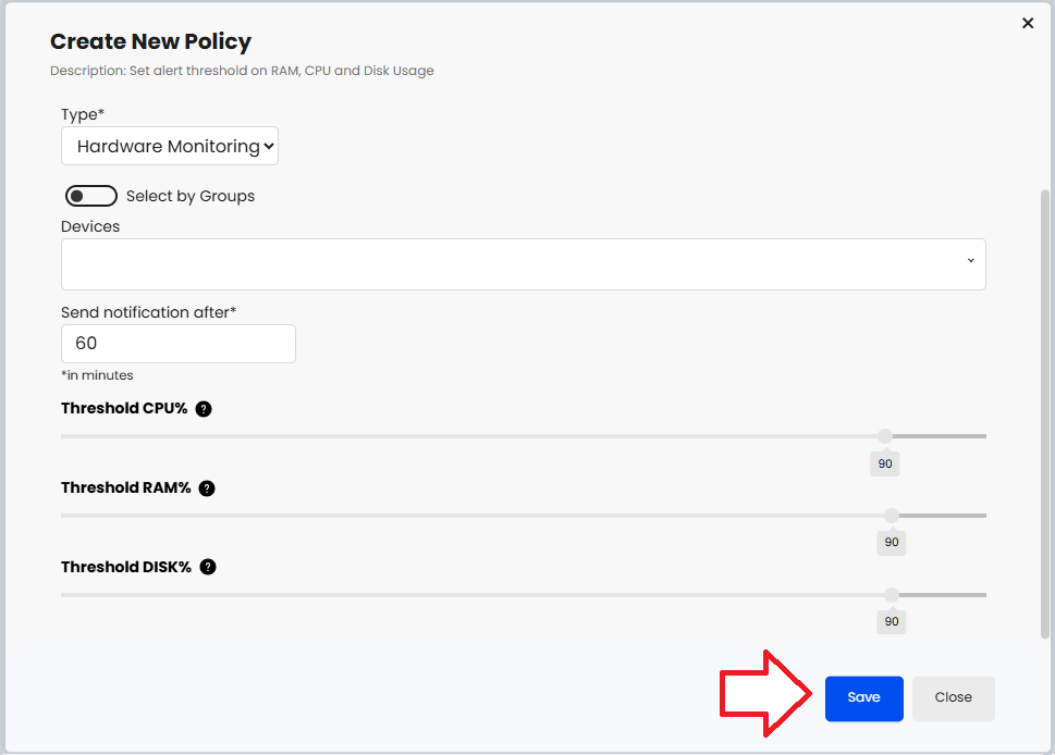 - Hardware Monitoring: This policy allows you to notify the user if RAM, CPU and disk exceed a certain threshold.