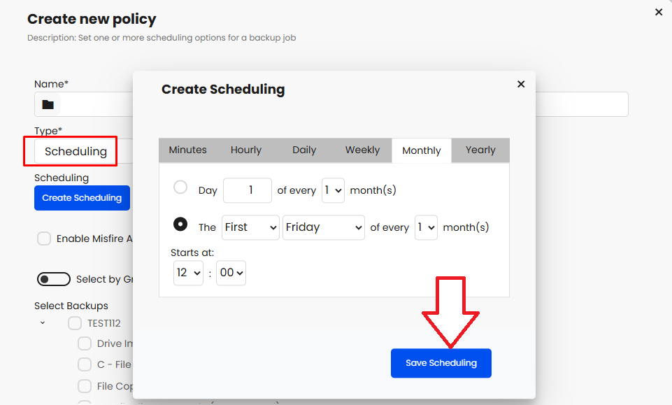 - Scheduling: Use this policy in your backup configuration, specifying a specific schedule for backups (daily, weekly, monthly, yearly)