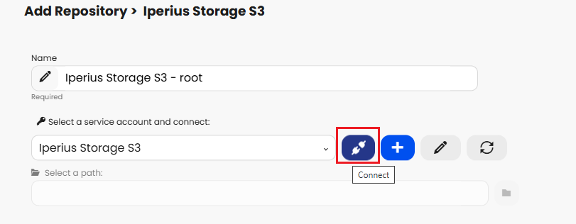 In the drop-down menu we already find the S3 credentials we just created, we click on “Connect” to test the connection and then specify the folder to use as the repository: