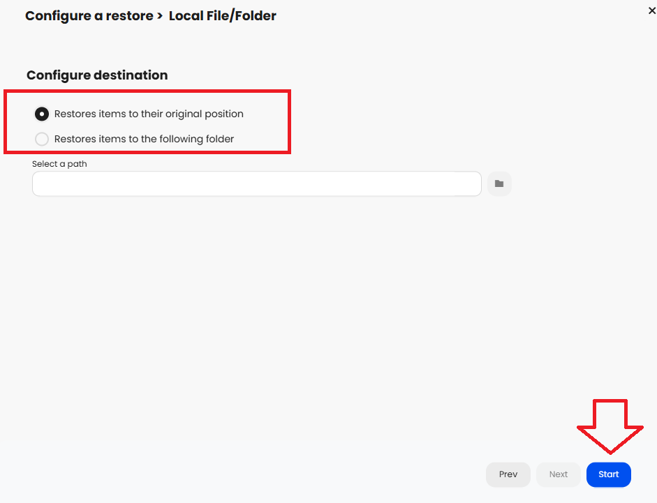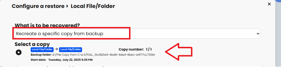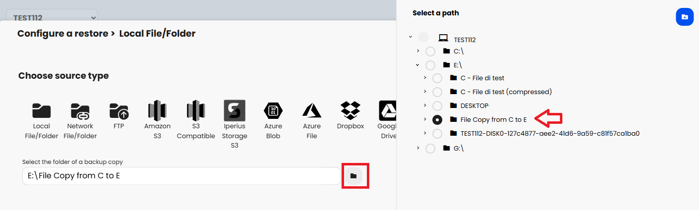 For example, to restore a backup to a local path, we choose “Local File/folders” and select the path where the backup to be restored is saved (in our case, for example, it is a local path) and click on “Next”: