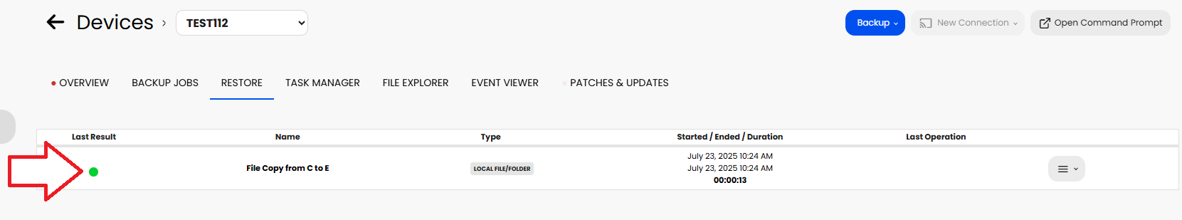Now the restore operation is in the device’s Restore list, with the execution result: